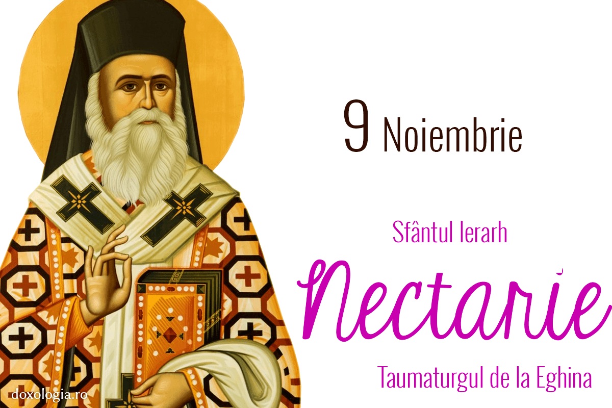 Trăind ca un înger în trup și iubind neîncetata rugăciune tăcerea smerenia postul și milostenia Sfântul Nectarie trăgea pe mulți la Hristos revărsând în jurul lui pacea bucuria și lumina cea necreată. Sfantul Nectarie ierarhul din insula Eghina s-a nascut in anul 1885 in localitatea Silivria in apropiere de Constantinopol si a trecut la cele vesnice in noaptea zilei de 8 noiembrie 1920 fiind inmormantat in ctitoria sa din insula Eghina. Biserica Ortodoxa il praznuieste pe Sfantul Nectarie in ziua de 9 noiembrie.
